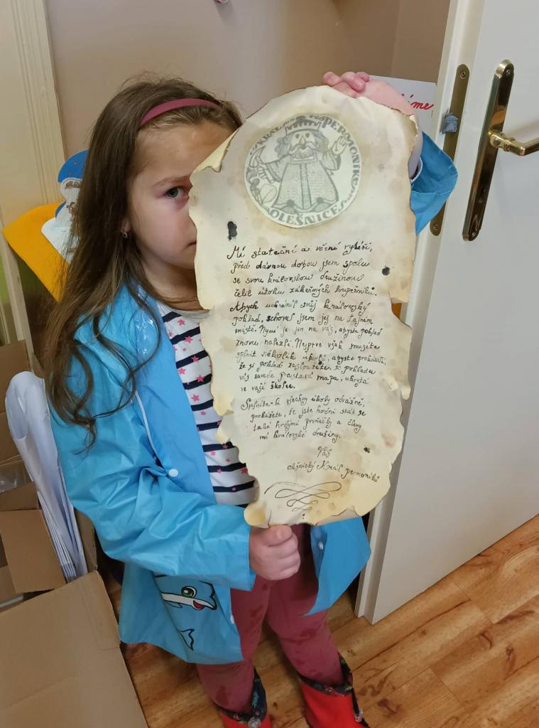 Na rozloučenou s koncem školního roku jsme se s dětmi vydali hledat ztracený poklad olešnického Krále permoníků. Za splnění všech úkolů a prokázanou odvahu byli naši předškoláčci slavnostně pasováni na žáky 1. třídy a spolu s částí pokladu dostali i pamětní list a dárek na rozloučenou.